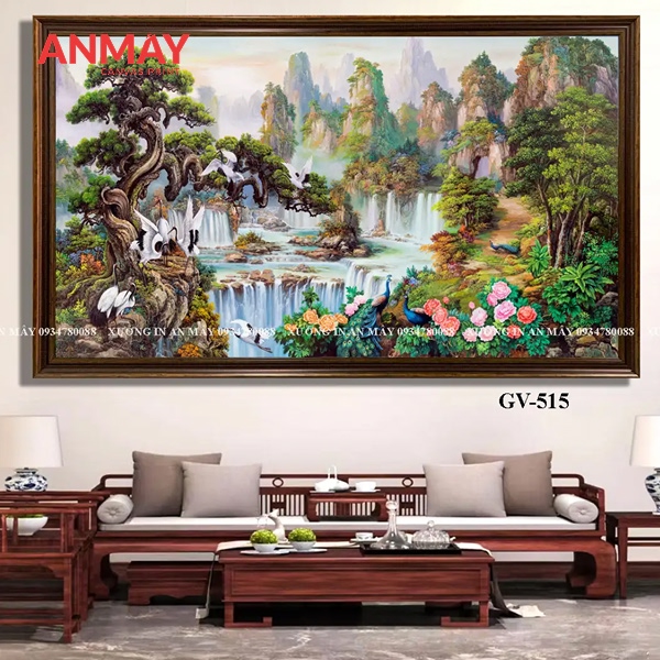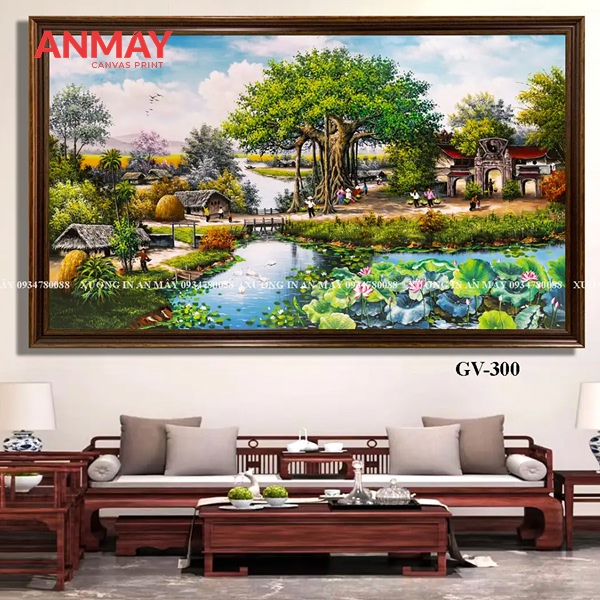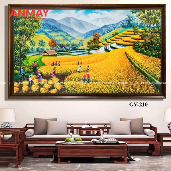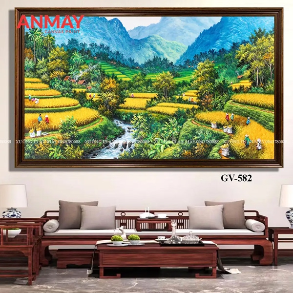 - Phòng khách lớn: Đây là nơi dễ tạo ấn tượng đầu tiên với khách đến nhà. Tranh in vẽ tay kích thước lớn (100‑200 cm chiều dài/chiều rộng) sẽ làm điểm nhấn mạnh, đặc biệt nếu treo phía sau sofa hoặc ở tường trống hẳn.